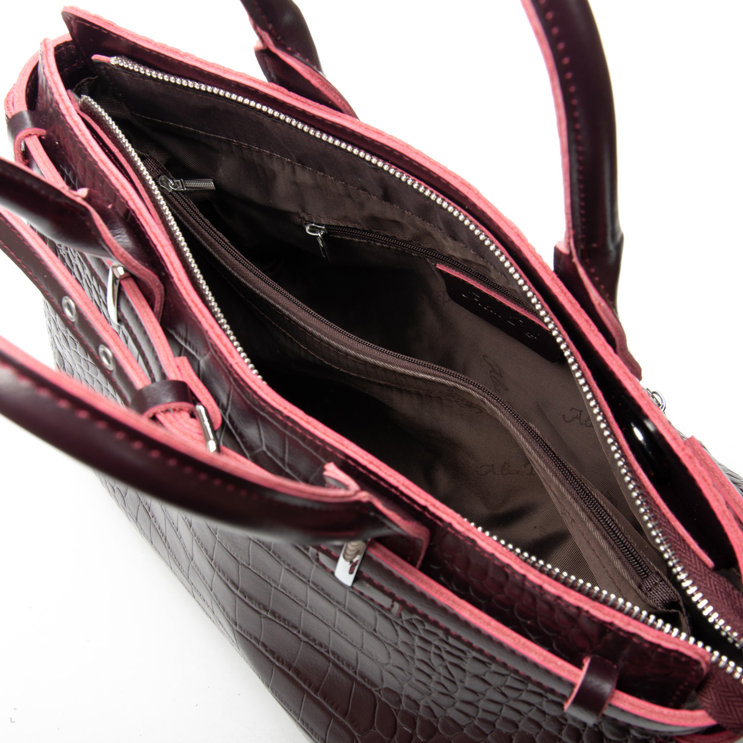 Застібається на блискавку. Всередині знаходиться подвійне відділення, розділене кишенею-перегородкою на блискавці, відкрита кишеня і бічна кишеня на блискавці. Зовні сумки на зворотному боці є велика кишеня на блискавці. Ущільнене дно на металевих ніжках.