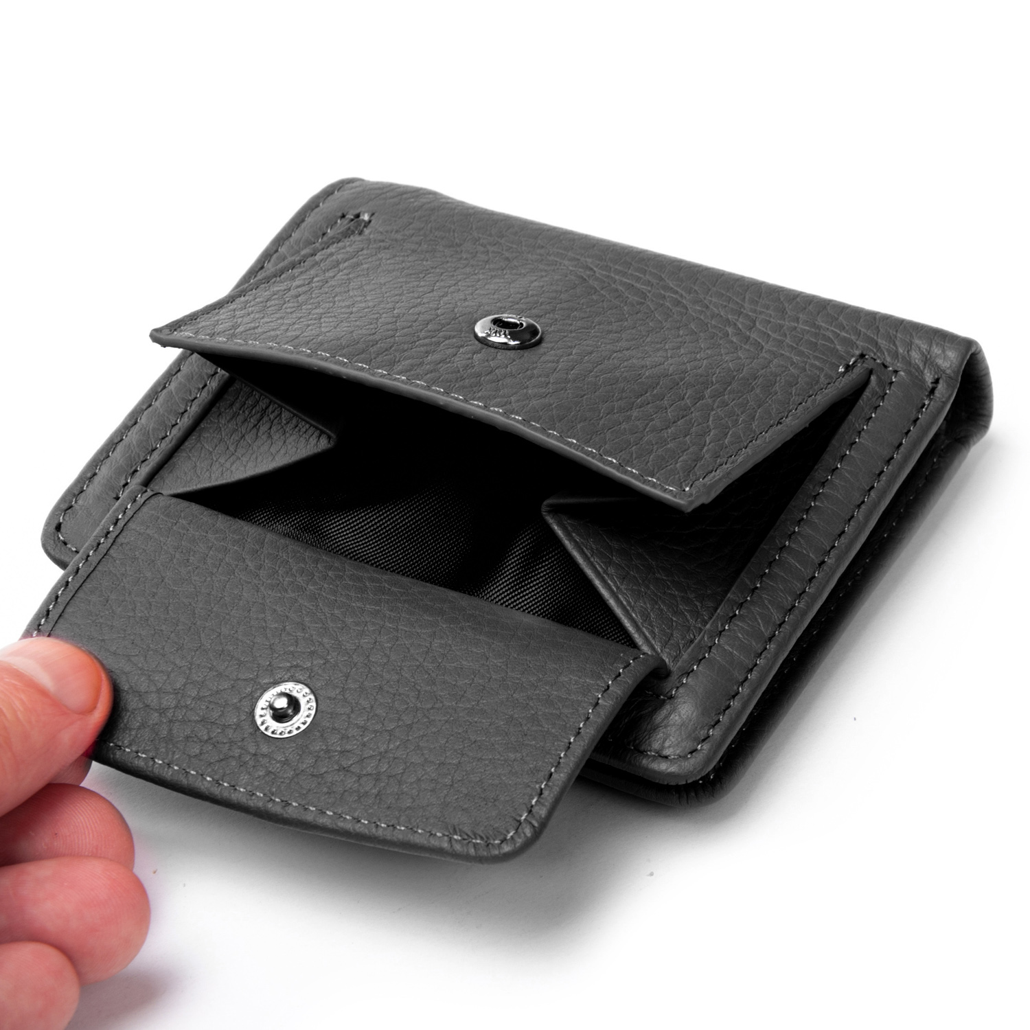 Всередині знаходяться два великих відкритих відділення для банкнот (розділені шкіряною перегородкою) і одне відділення на блискавці. Також є 12 кишень для візитних карток, 4 з яких виконані прозорими. Зовні гаманця на зворотному боці є монетниця на кнопці.