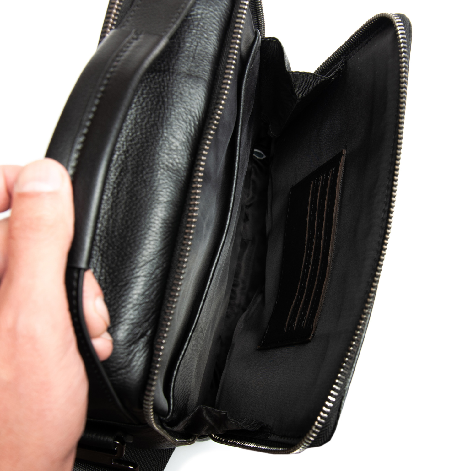 Виготовлена з м'якої натуральної шкіри. Два відділення, закриваються на блискавку. Всередині відділень є відкрита кишеня і бічна кишеня на блискавці. На зворотному боці сумки є кишеня на блискавці.