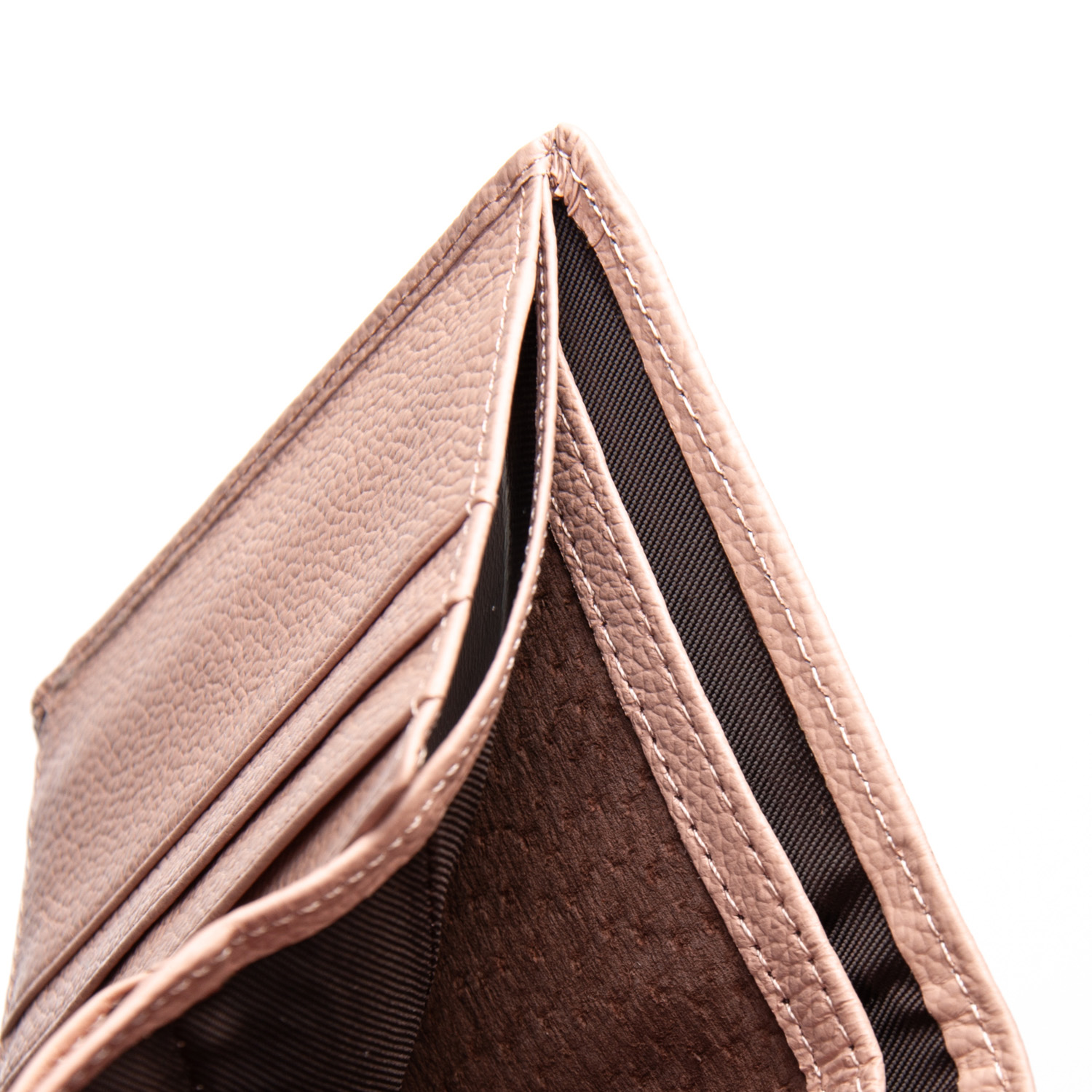 Всередині знаходяться 2 відкритих відділення для банкнот, розділені шкіряною перегородкою, 3 кишені для візитних карток і дві великі прозорі кишені на відкидному блоці. Також всередині гаманця знаходиться монетниця під клапаном на кнопці.
